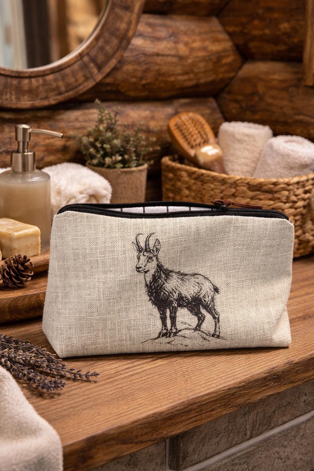 Small light beige toiletry bag, coated cotton interior.Imitation leather lace.Drawing, screen printing and handcrafted production.Limited edition20 x 15 x 8 cm
